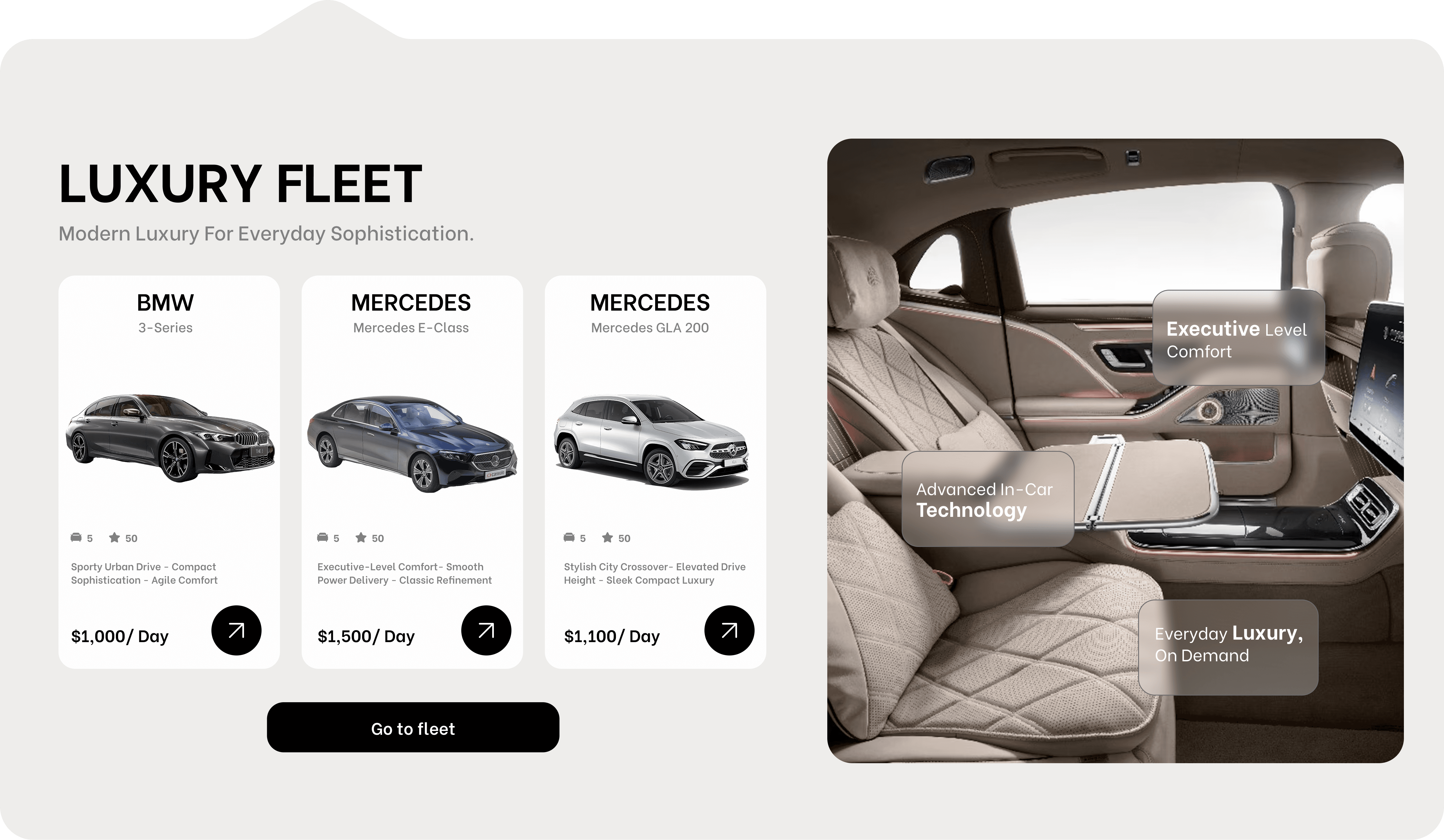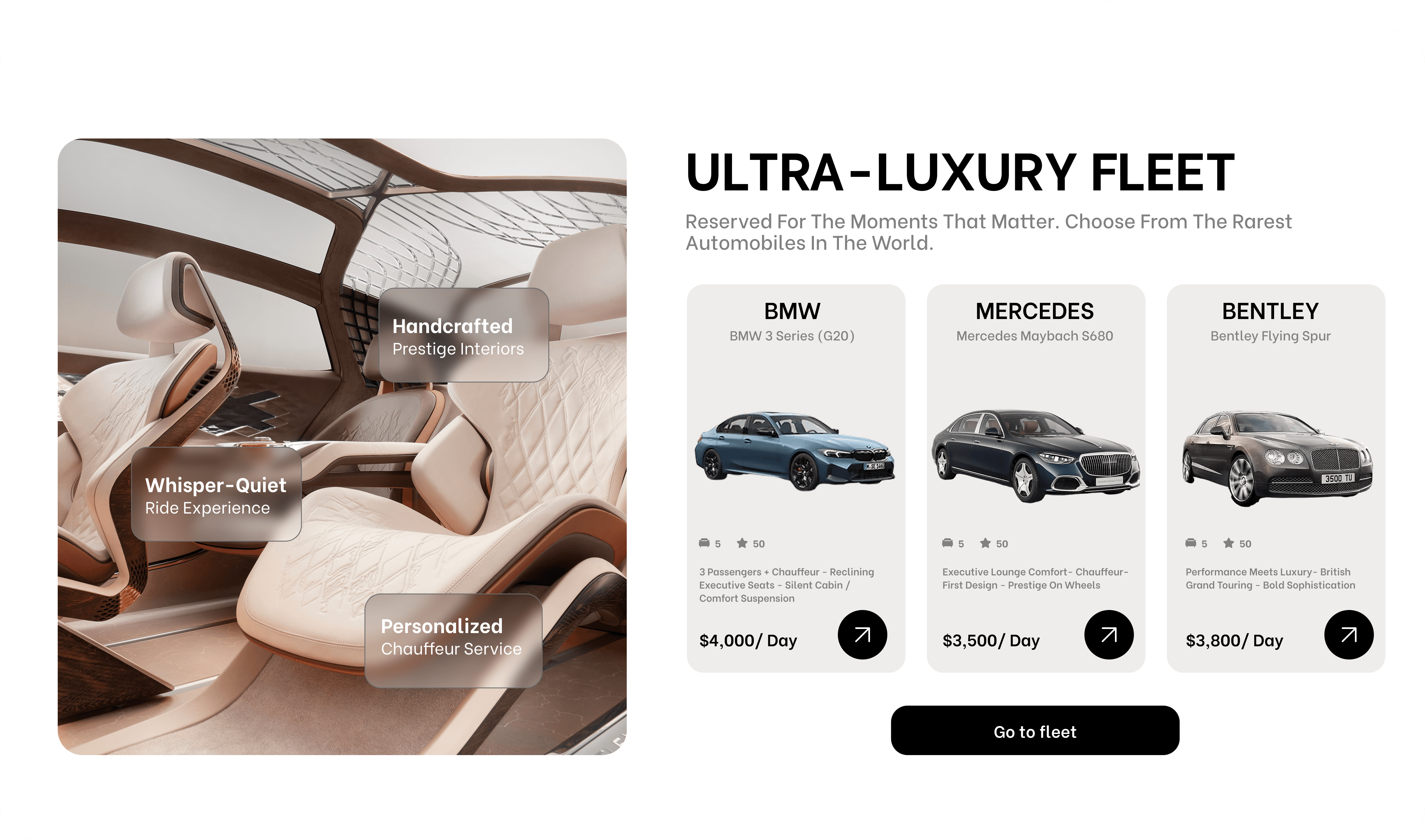 Select from a curated collection of high-end vehicles designed to match your lifestyle — from Rolls-Royce and Bentley to BMW and Mercedes — each with professional chauffeurs ensuring a seamless travel experience.